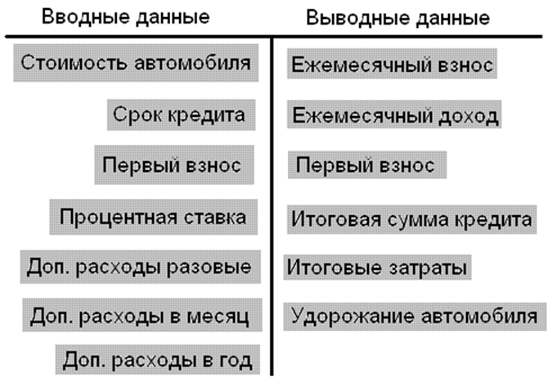 Данная схема позволит включить в себя любой нестандартный расчет автомобильного кредита. Можно заметить, что процент от ежегодного и ежемесячного взноса одна и та же сумма, но не стоит полагать, что обычный пользователь будет знать об этом. Стоит так же заметить, что может возникнуть несколько дополнительных условий в один период времени, поэтому программа должна предоставить пользователю возможность ввести несколько таких условий. Например, ежемесячный платеж состоит из уплаты определенной суммы, плюс уплаты определенного процента от стоимости автомобиля. В таком случае процент должен перевестись в денежный эквивалент, а потом суммироваться со всеми остальными ежемесячными платежами.