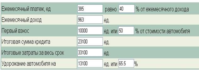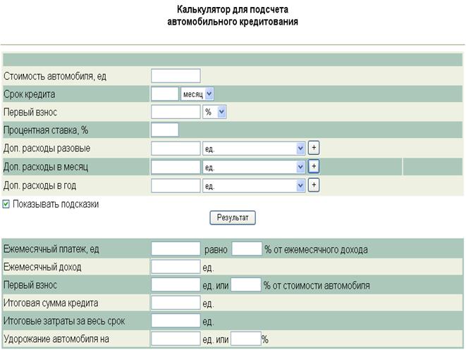 Принцип работы программы очень прост. В верхние поля пользователь вводит данные условия автокредитования, затем нажимает кнопку «расчет» и получает интересующие его результаты. Минимальными данными для заполнения является: