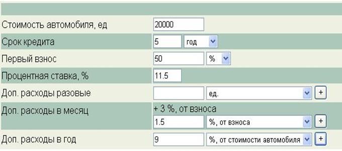 Только при заполнении данных полей программа выдаст результаты. Срок кредита, первый взнос, дополнительные расходы можно ввести в различных единицах. Кнопки «+» дают возможность вести неограниченное количество дополнительных условий.