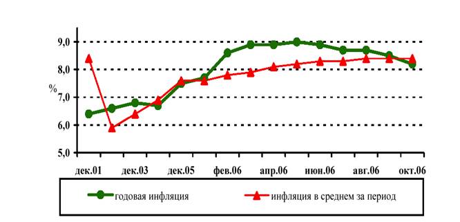Предпринятые Национальным Банком меры по ужесточению денежно-кредитной политики в начале 2006 года оказали сдерживающее влияние на инфляцию, которая в годовом выражении понизилась с 9,0% в мае 2006 года до 8,5% в сентябре 2006 года.