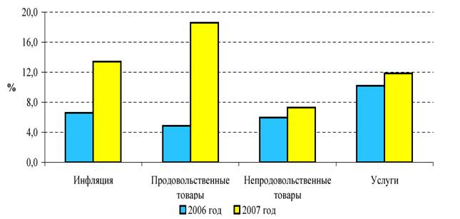 Ускорение инфляции было обусловлено ростом цен ее составляющих, главным образом, на продовольственные товары – на 18,6% (в январе - октябре 2006 года – на 4,9%), в незначительной степени на непродовольственные товары – на 7,3% (на 6,0%) и платных услуг - на 11,9% (на 10,2%).