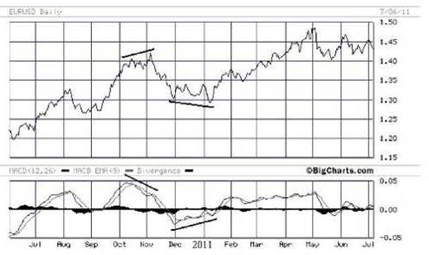 Рис. 1. Дивергенции между динамикой рынка и индикатором MACD на примере движения валютной пары «евро/доллар» в период с 02.06.2010 по 06.07.2011. Дивергенции отмечены наклонными отрезками