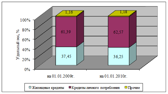 Можно сделать вывод о том, что наибольший удельный вес в составе выданных населению кредитов приходится на кредиты для целей личного потребления и жилищные кредиты. Общее соотношение сохранятся в течение года, но имеют место некоторые структурные сдвиги в сторону увеличения доли жилищных кредитов при одновременном сокращении размера непосредственно так называемого «потребительского» кредита.