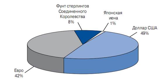 Распределение активов Банка России в резервных валютах по видам валют. Валютные активы Банка России в течение 2008 г. были номинированы в долларах США, евро, фунтах стерлингов Соединенного Королевства и японских иенах (рис. 1).